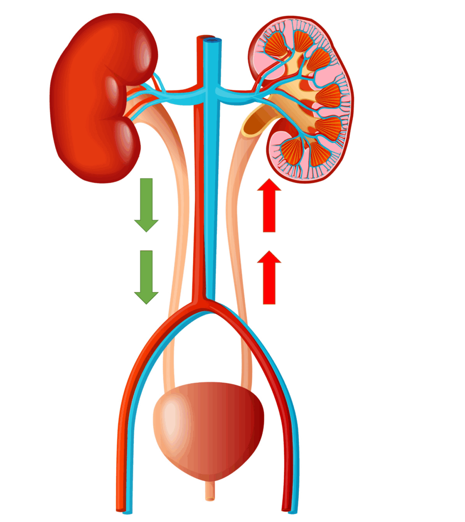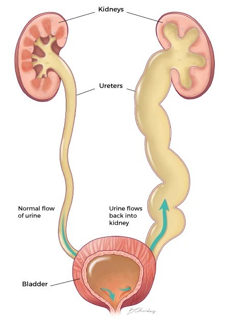 Normally, urine flows down the urinary tract, from the kidneys, through the ureters, to the bladder. With VUR, some urine will flow back up—or reflux—through one or both ureters and may reach the kidneys.