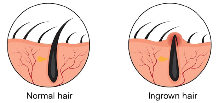 Ingrown hair occurs when a hair that’s been removed starts to grow back and curves into the skin. This usually happens after shaving, tweezing or waxing.