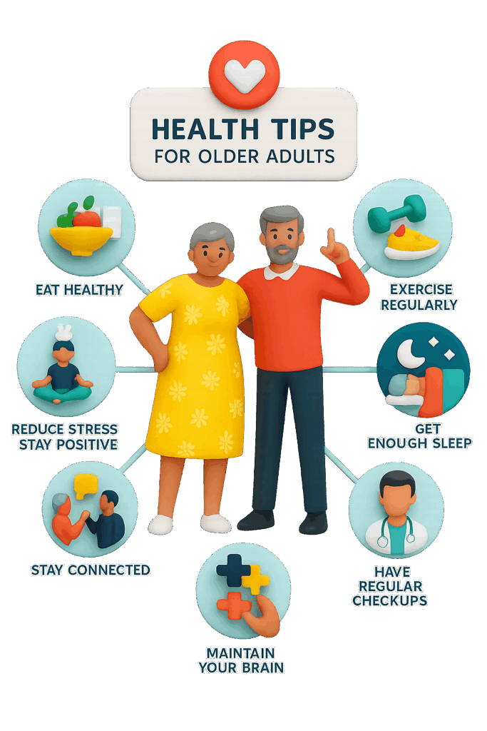 As you grow older, you go through many changes, and you may need to adjust your lifestyle for healthy aging. Healthy eating and regular physical activity can be keys to good health at any age. Making suitable lifestyle choices may also prevent some health problems, such as diabetes, heart disease, and some cancers. Health tips include